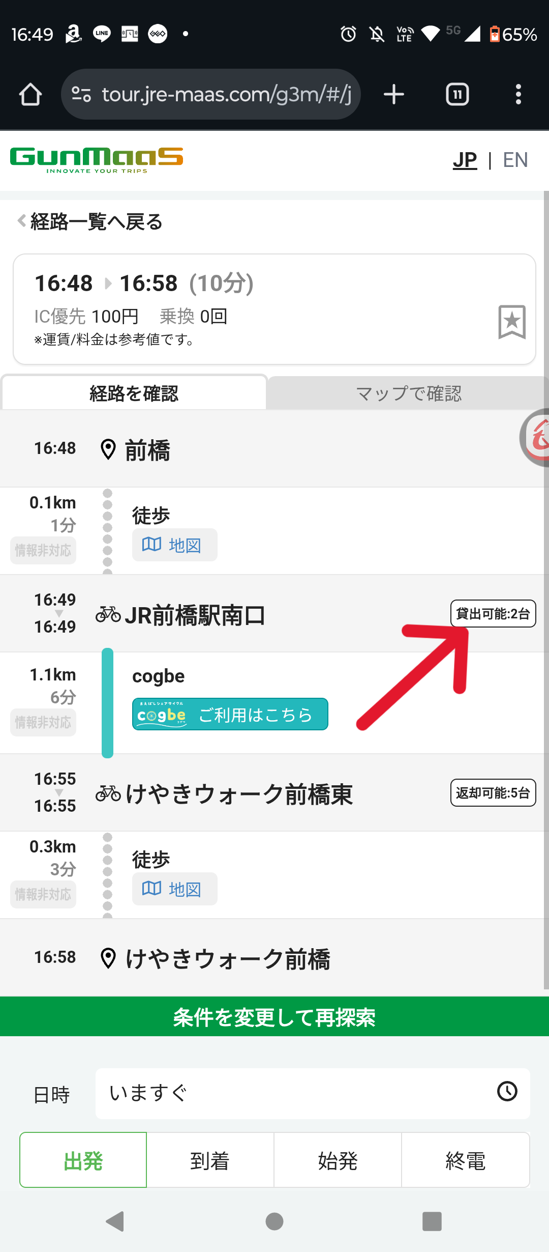シェアサイクルコグベもこのように検索時点で貸出が可能かどうか表示されるようになりました😊