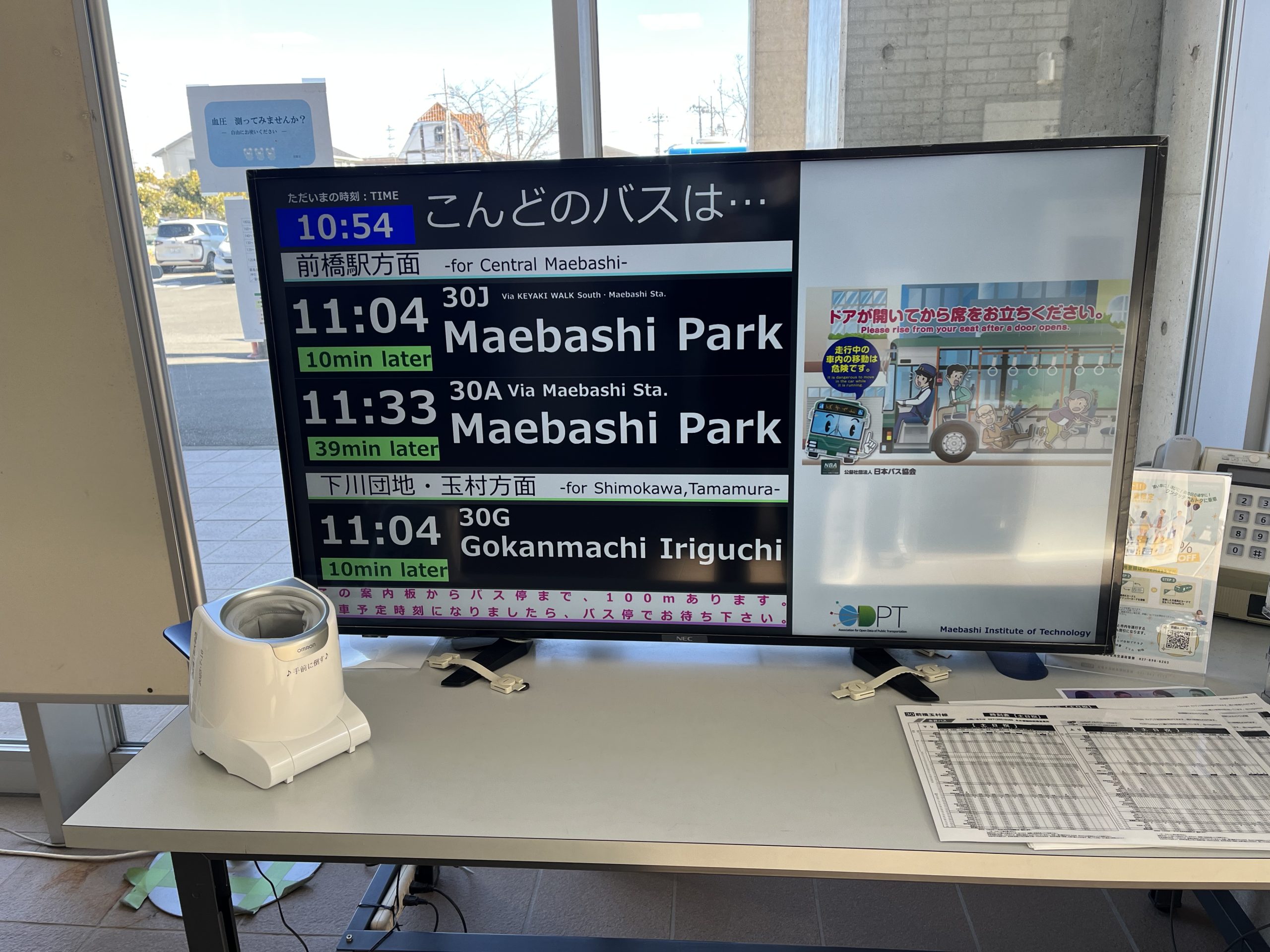 前橋工科大学には1号館入口とバス乗り場にデジタルサイネージが設置され、バスの遅延情報が確認できます!前橋工科大学は安心して公共交通を利用できるような整備がされています!在校生の方はもちろん、これから前橋工科大学への入学を考えている皆さんもぜひ、公共交通での通学をしましょう🚍