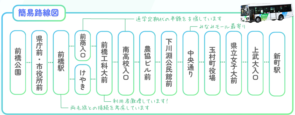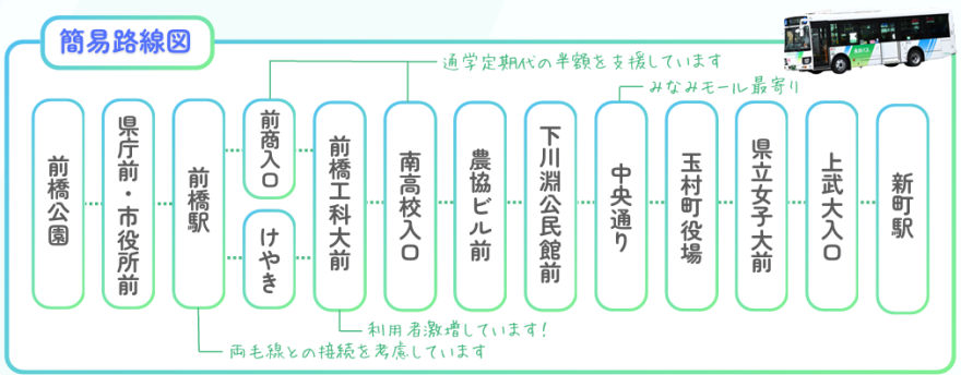 「前橋公園、群馬県庁、前橋市役所、前橋駅、前橋商業高、けやきウォーク、前橋工科大、前橋南高、パワーモール前橋みなみ、県立女子大、玉村町役場などなど、お買い物、通勤、通学等にアクセスが抜群のバス路線です。